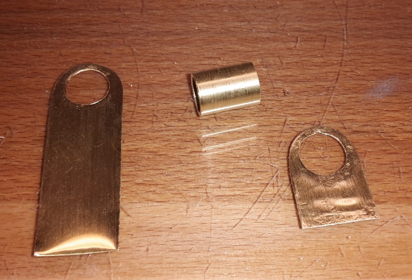 Also los. Die Steuerseile für das HR laufen innerhalb des waagerechten Rohres nach hinten. Deswegen kann der Steuerknüppel in QR Richtung bewegt werden, ohne mit den Seilen in Konflikt zukommen. Also muss das Rohr aufgeschnitten werden und Umlenkrollen eingebaut werden. Die sind auf der Drehbank entstanden. Der Rest besteht wieder aus Antennenröhrchen und dünnem Messingblech. Ebenso wie das Horn, an dem die QR Seile angehängt werden. Letzteres sieht sehr massiv aus, ist aber eigentlich hohl und deswegen sehr leicht.